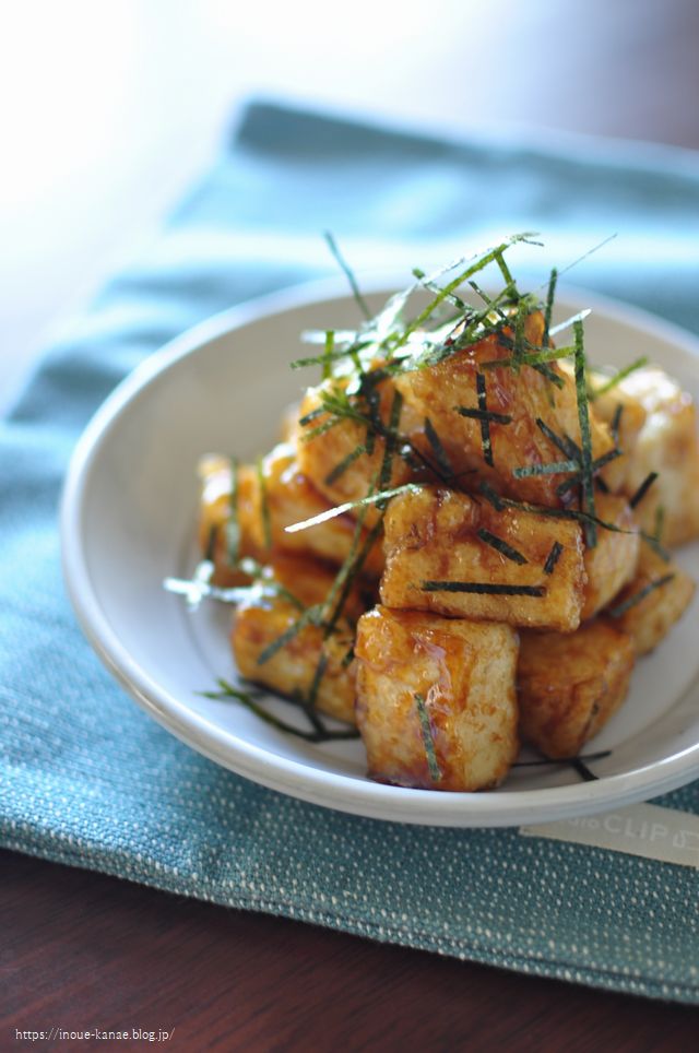 お豆腐に片栗粉をまぶして、フライパンにちょっと多めの油をひいて揚げ焼きにしたものに、甘辛い醤油だれを絡めたものを作りました。おかずっていうか···